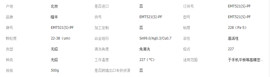 EMT521(S)-PF无铅含银焊锡膏Sn99.0/Ag0.3/Cu0.7(S)500g
